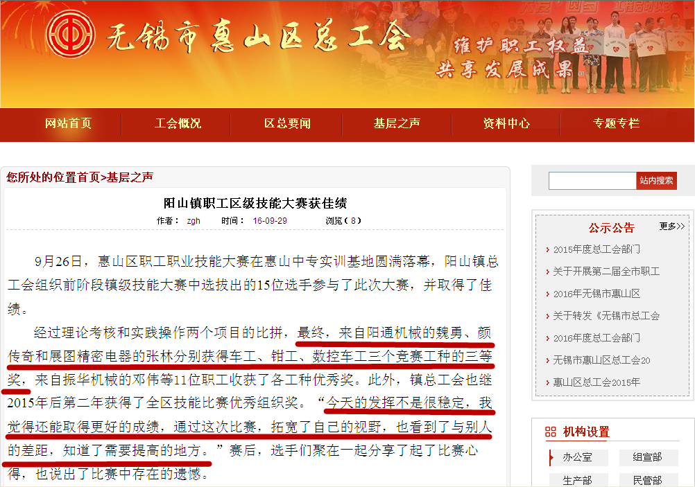 9月26日, 2016年惠山區(qū)職工職業(yè)技能大賽在惠山中等專業(yè)學校實訓基地鳴鑼開賽; 這次比賽結(jié)束獲獎的顏傳奇、魏勇在“無錫市惠山區(qū)總工會”網(wǎng)站上刊登表揚。如圖所示